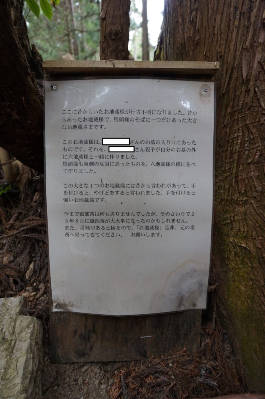 あと、同じ看板には、お地蔵さんが盗まれたことにより、平成25年5月8日に嶽部落(がくぶらく)が大火事になったのかもしれませんとの内容もありました。