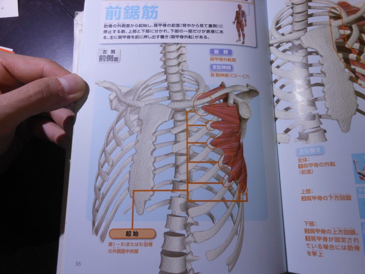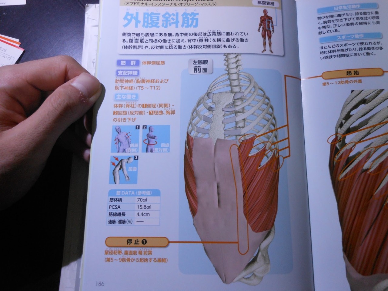 それぞれ前鋸筋と外腹斜筋ですね。まあ個別については次に見るとして、なんか大胸筋が立体的になったなあとこの写真で思いました。そして前も言ったかもしれないが、全体的にデブったorz。顔に肉ついてるんですよねー。嫌だああああ。