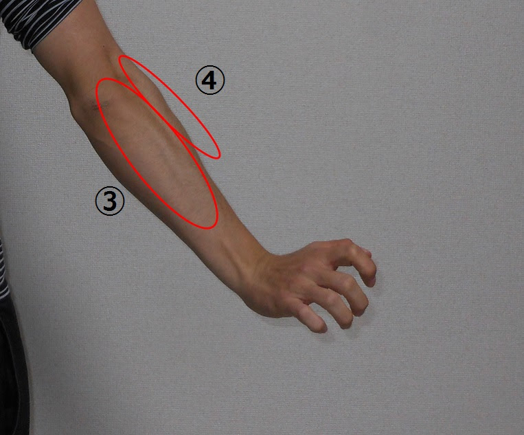 ③の手の甲側の真ん中の筋群は、「手関節背屈筋群(しゅかんせつはいくつきんぐん)」「手指伸展筋群(しゅししんてんきんぐん)」の2つが位置しています。手の甲側に手首を曲げる手関節の背屈(はいくつ)動作や、指を開く動作である指の伸展を主に担当しています。