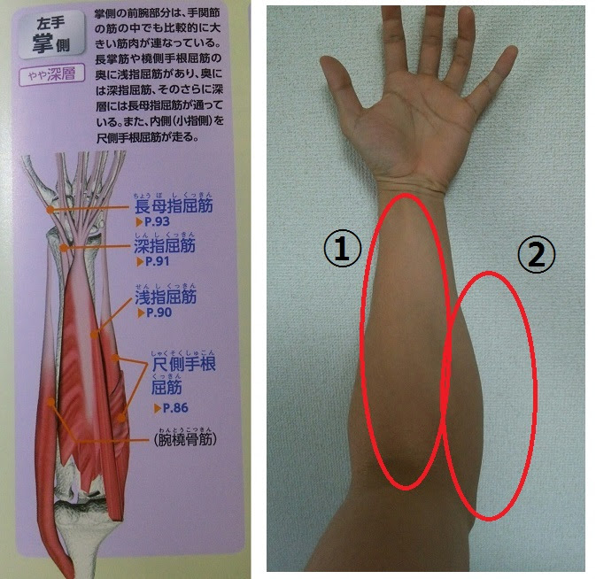 ①の手のひら側真ん中の筋群は、「手関節掌屈筋群(しゅかんせつしょうくつきんぐん)」「手指屈曲筋群(しゅしくっきょくきんぐん)」の二つが位置しています。手のひら側に手首を曲げる手関節の掌屈(しょうくつ)動作や、指をたたむ動作である指の屈曲を主に担当しています。