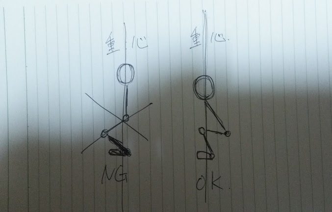 膝関節を重心から「大きく外さず」と書いたのには理由があります。例えば、膝関節の位置を完全に固定してスクワットを行うといったいどうなるでしょうか?上の図の左側のように上半身はどんどん床に平行になっていきます。めちゃくちゃ体が柔らかい人ならば上半身を完全に床と並行になるまで股関節を曲げることができると思います。では、それより腰を下げようとするといったいどうなるかと言いますと、右下の図のように再び上半身が起きてしまい、最終的に重心と足の裏側の位置がずれてしまい後ろに倒れてしまいます。よって、腰を深く落とすためには多少なりとも膝は前に出てしまいます。これは人間の構造上当たり前のことで、これが上記の理由になります。